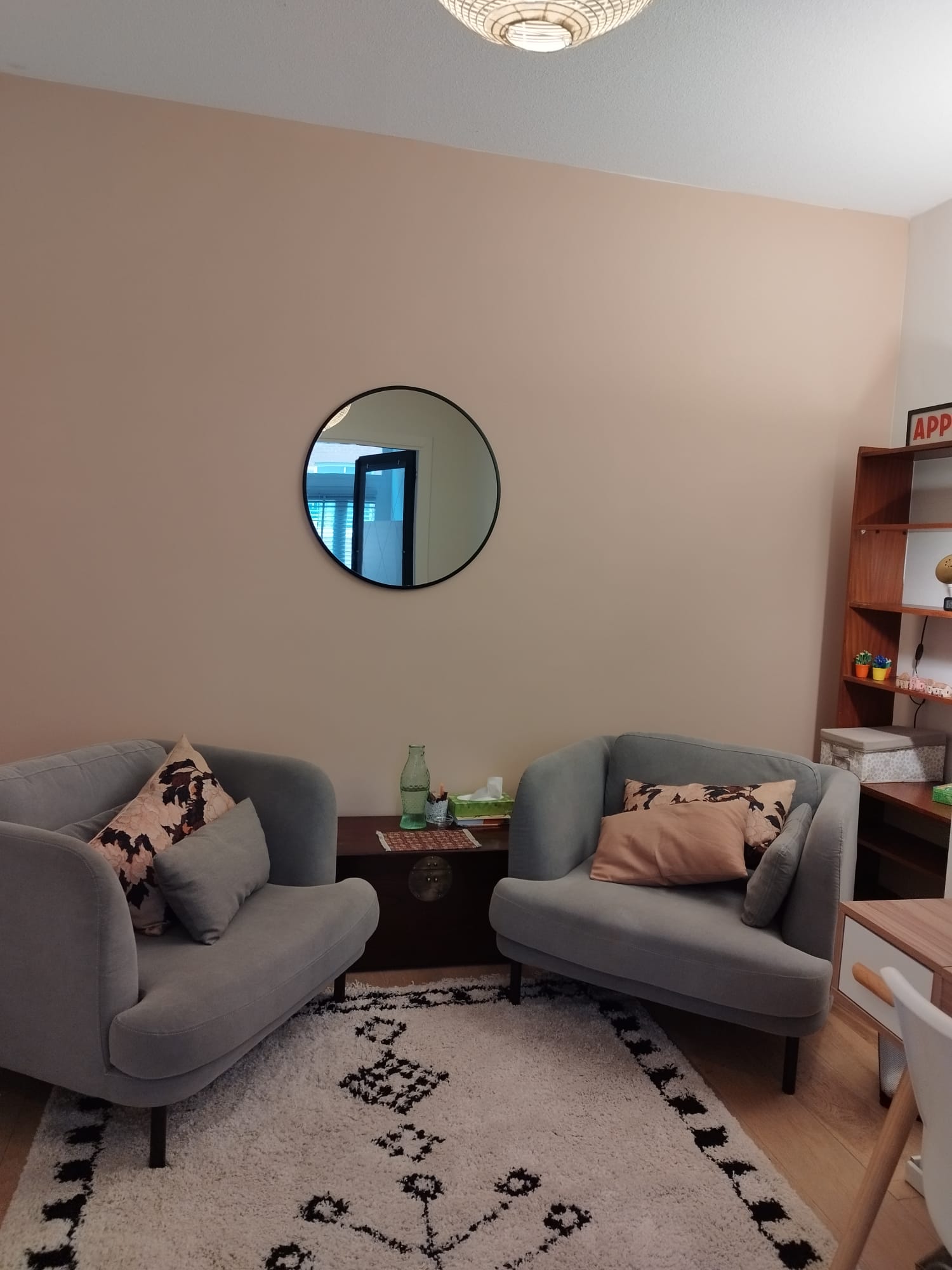 -The back room includes lots of natural light, a double seat sofa to see couples if needed and a desk to see virtual clients.